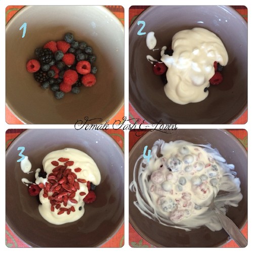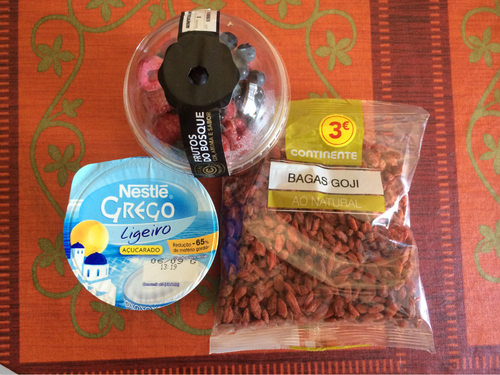 Juntam tudo num recipiente: primeiro uma porção de frutos vermelhos, de seguida o iogurte e por fim uma colher de sopa (pouco cheia) de bagas gogi.