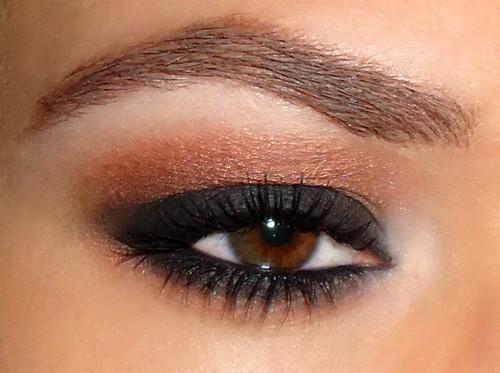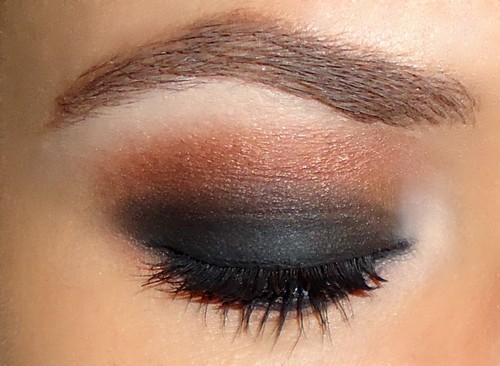 Usei uma sombra em tons de terra e um pincel de esfumar, para esbater os cantos e linhas da sombra preta, para que fizesse um degradê bonito com a cor que apliquei de seguida – um tom tijolo (ligeiramente mais avermelhado) por todo o concavo e parte externa da pálpebra móvel, esbatendo a cor que restou no pincel na linha das pestanas inferiores, por cima do preto.